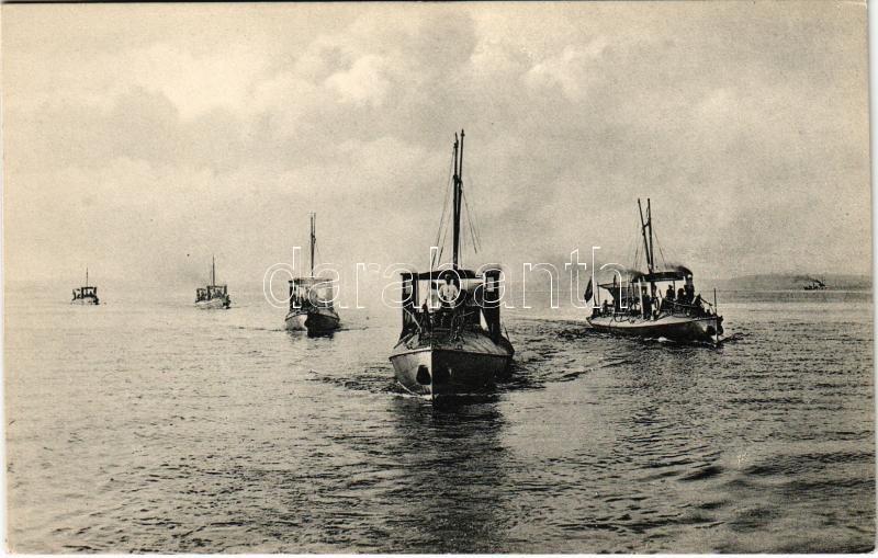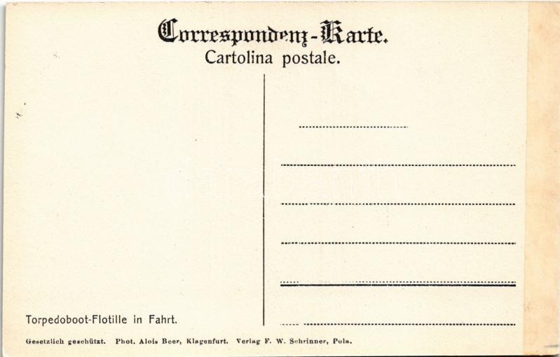 Leírás: Torpedoboot-Flotille in Fahrt / WWI Austro-Hungarian Navy, K.u.K. Kriegsmarine torpedo boats. Phot. Alois Beer. Verlag F.W. Schrinner (Pola) (ragasztónyom / glue mark)