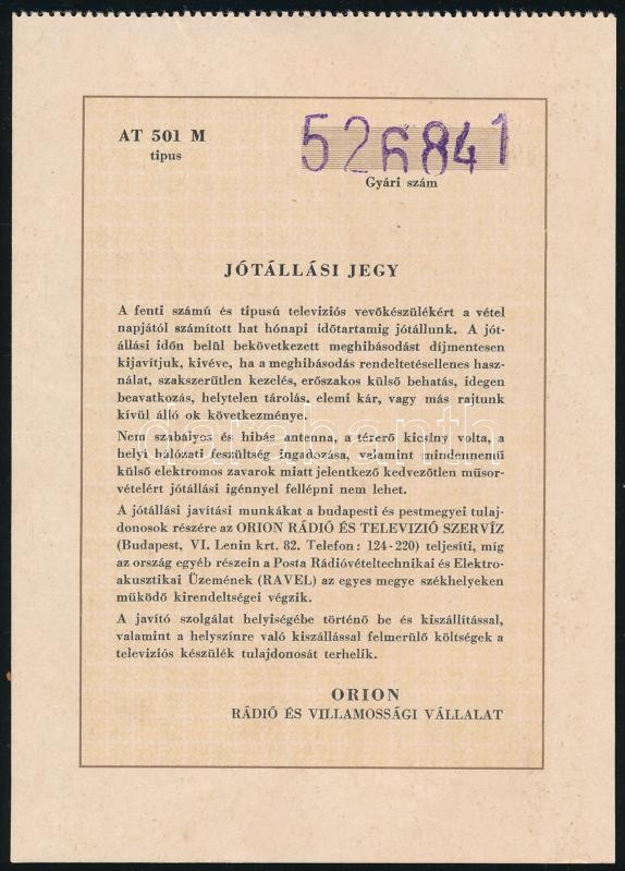 Leírás: 1959 Orion AT 501 M televízió használati utasítása, 14 p., fekete-fehér képekkel illusztrált, MEO tanúsítvánnyal, kissé sérült, foltos + jótállási jegy