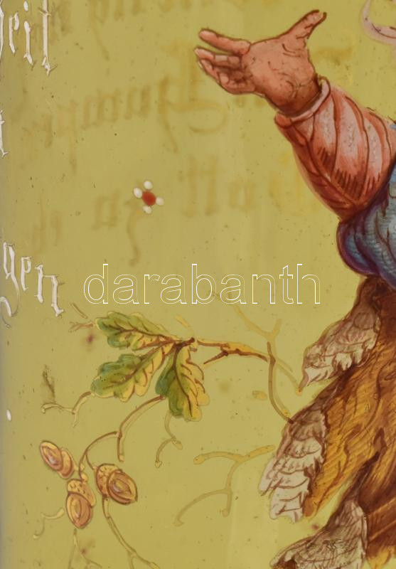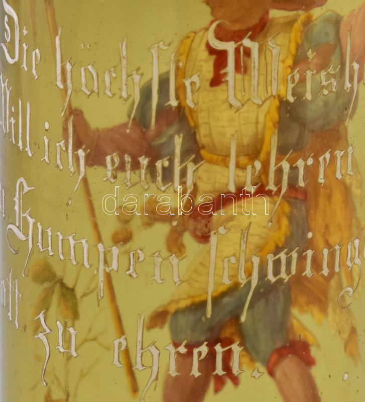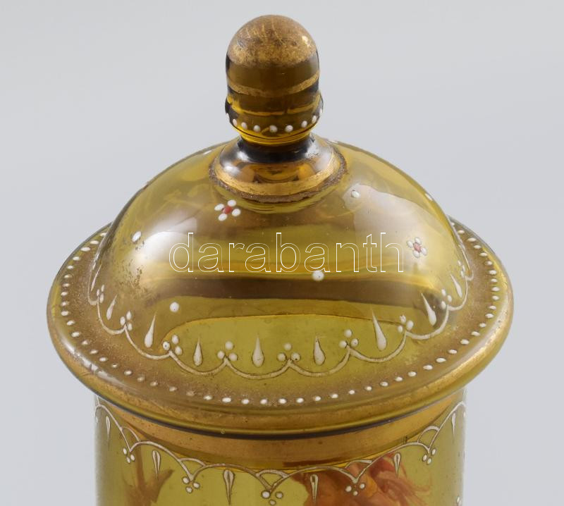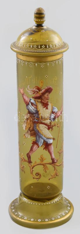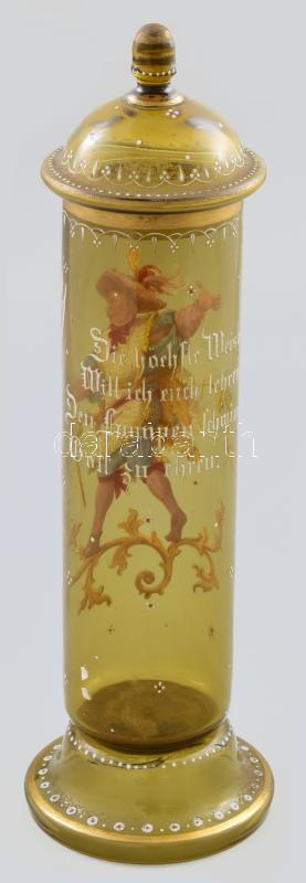 Díszüveg fedeles kínáló. Kézzel festett, cca 1870. Humoros német nyelvű szöveggel. Alján feszültségi repedés 39 cm / German decor glass bowl. Hand painted 39 cm