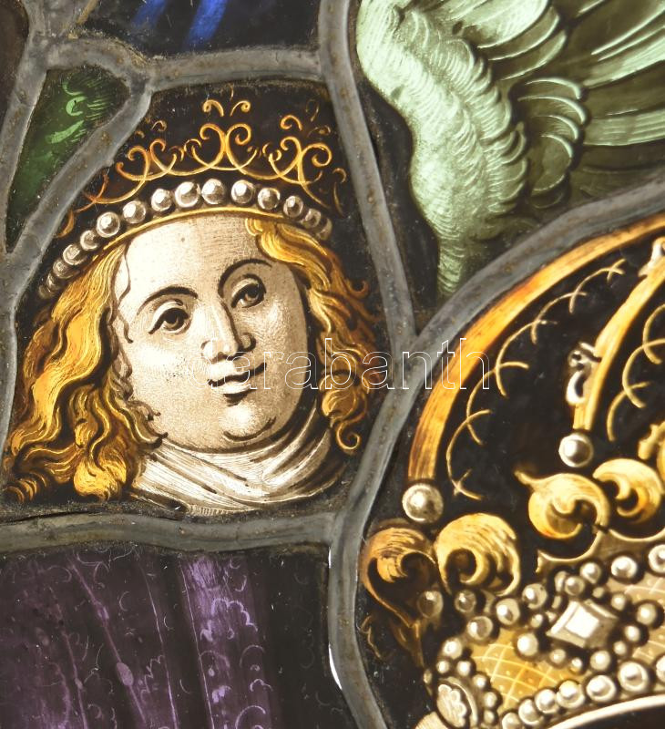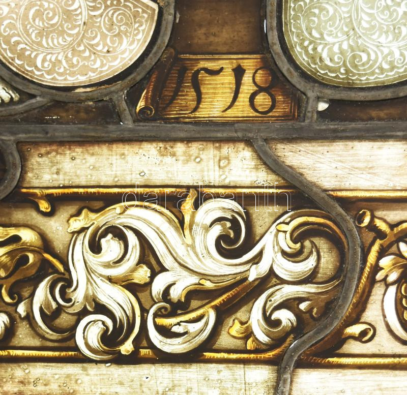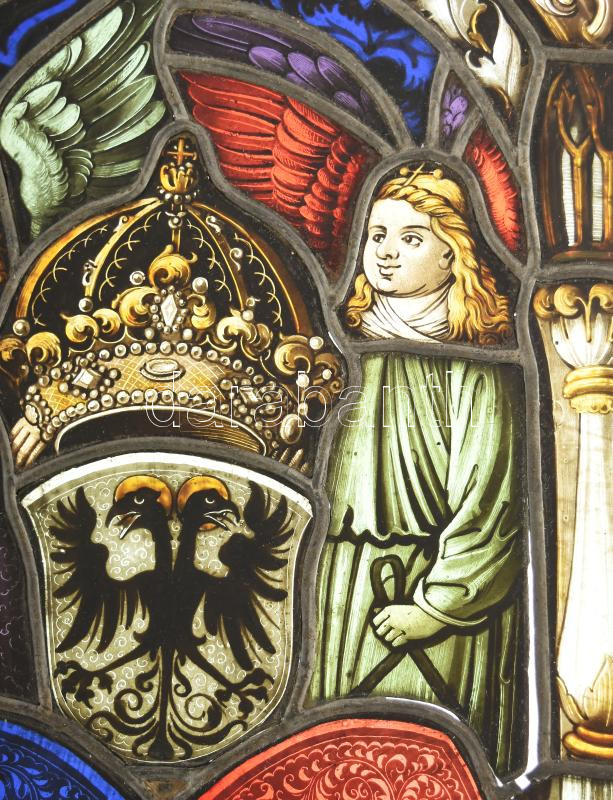 I. Ferdinánd császár és Jagelló Anna császárnő esküvőjének emlékére festett ólomüveg ablak, dísz. Osztrák császári címert tartó angyalokkal. 1518-as évszámmal. Sérült 26x44 cm / Marriage of Emperor Ferdinand and Anna Jagello. Lead glass ornament with Habsburg coat of arms and year 1518. Damaged 26x44 cm