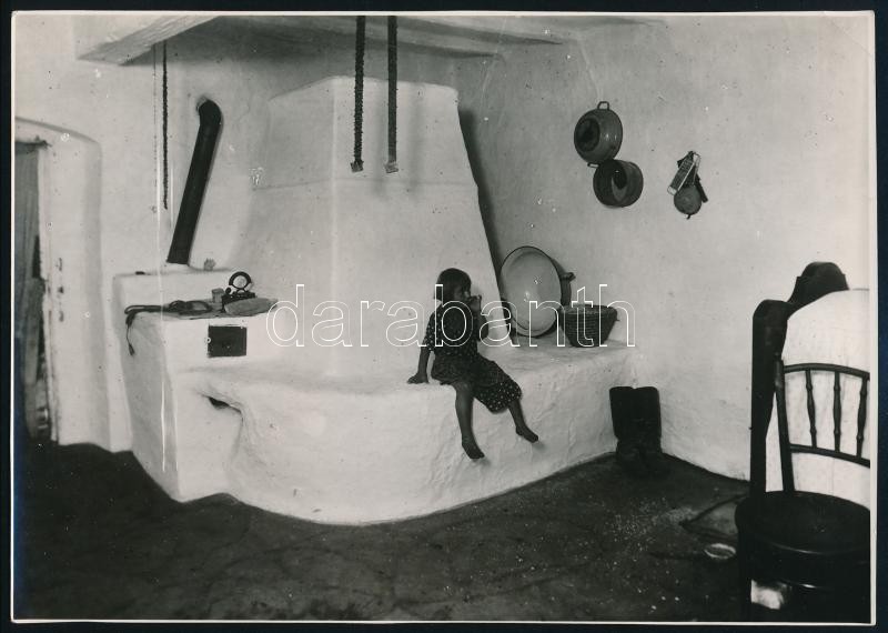 cca 1940-1950 Kislány a kemence padkánál, néprajzi fotó, jelzés nélkül...