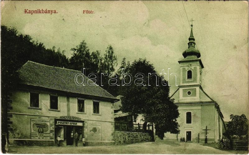 1913 Kapnikbánya, Cavnic; Fő tér, templom, Pusztay Gyula magyar áruház...