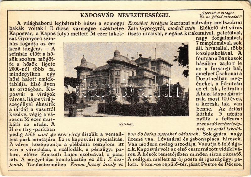 Kaposvár, Színház. Kaposvár nevezetességei. Farkasfalvi Kornél kiadása... https://www.darabanth.com/hu/413-Gyorsarveres/413.0/Kepeslapok/Magyarorszag~2000006/Kaposvar-Szinhaz-Kaposvar-nevezetessegei-Farkasfalvi-Kornel-kiadasa-EB~II2577982