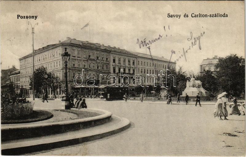 1914 Pozsony, Pressburg, Bratislava; Savoy és Carlton szálloda, villam... https://www.darabanth.com/hu/417-Gyorsarveres/417.0/Kepeslapok/Felvidek~1500006/1914-Pozsony-Pressburg-Bratislava-Savoy-es-Carlton-szalloda-villamos-hotel-tram-EK~II2629412