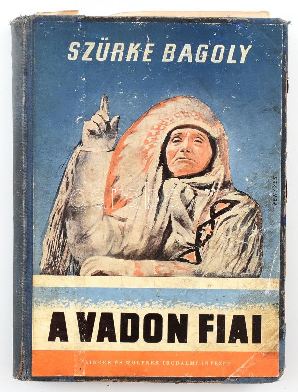 [Belaney, Archibald Stansfield] Szürke Bagoly (Grey Owl): A vadon fiai. Ford.: Dr. Baktay Ervin. Bp., [1940], Singer és Wolfner, 240 p. + 8 t. A borító Fenyves Sándor munkája. Átkötött félvászon-kötés, átkötéskor az eredeti illusztrált papírborító egy részét felhasználták, kissé sérült, kopott borítóval, néhány képtábla kijár.