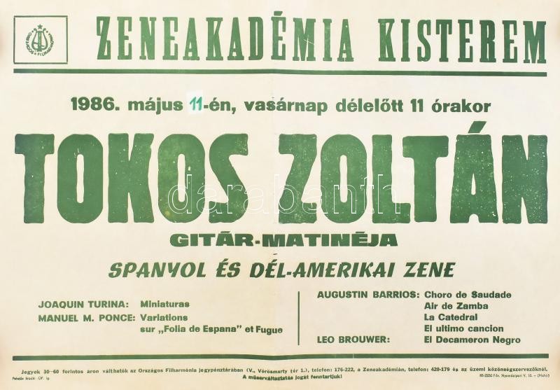 1986 Zeneakadémia Kisterem, Tokos Zoltán gitár-matinéja, plakát, felte...