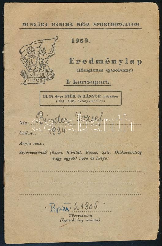 1950 MHK (Munkára Harcra Kész Sportmozgalom) eredménylap https://www.darabanth.com/hu/419-Gyorsarveres/419.0/Mutargy-papirregiseg-egyeb/Okmanyok~500020/1950-MHK-Munkara-Harcra-Kesz-Sportmozgalom-eredmenylap~II2649742