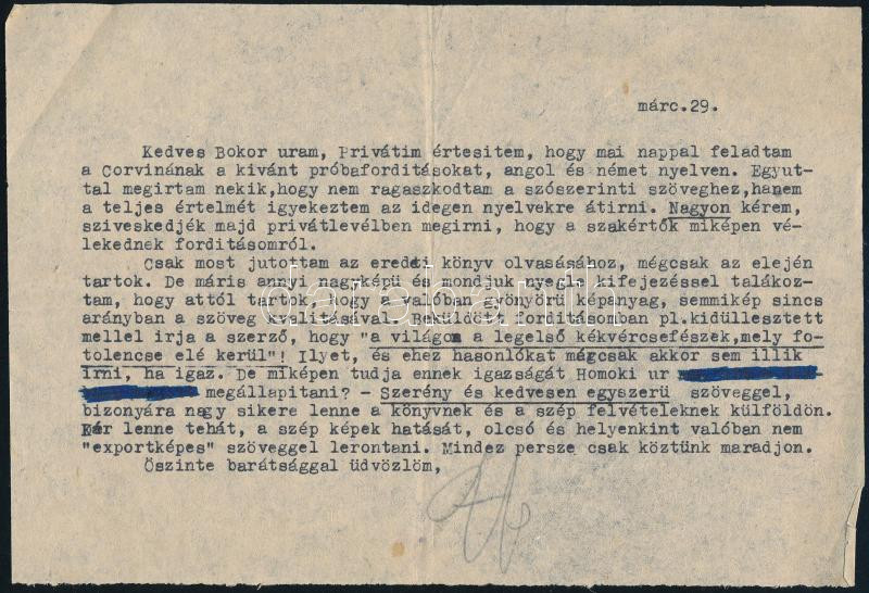 cca 1954? gróf Széchenyi Zsigmond (1898-1967) vadász, utazó, író autográf aláírással ellátott, gépelt levele Bokor Dezső (1894-1963) szerkesztő, kiadó részére, benne: "Kedves Bokor uram, Privátim értesítem, hogy mai nappal feladtam a Corvinának a kívánt próbafordításokat, angol és német nyelven. Egyuttal megirtam nekik, hogy nem ragaszkodtam a szószerinti szöveghez, hanem a teljes értelmét igyekeztem az idegen nyelvekre átírni. .... Csak most jutottam az eredeti könyv olvasásához, mégcsak az elején tartok. De máris annyi nagyképü és mondjuk nyegle kifejezéssel találkoztam, hogy attól tartok, hogy a valóban gyönyörü képanyag, semmikép sincs arányban a szöveg kvalitásával. Beküldött fordításomban pl. kidüllesztett mellel írja a szerző, hogy a "világon a legelső kékvércsefészek, mely fotolencse elé kerül"! Ilyet és ehez hasonlókat mégcsak akkor sem illik írni, ha igaz. De miképpen tudja ennek igazságát Homoki ur megállapítani? ...." "Homoki ur" = Homoki Nagy István (1914-1979) Kossuth-díjas filmrendező, operatőr. 1954-ben filmet rendezett "A kékvércsék erdejében" címmel.