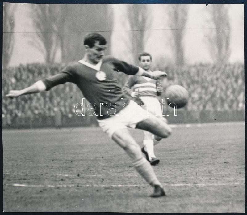 cca 1960-1970 Tichy Lajos (1935-1999) magyar válogatott labdarúgó, a Bp. Honvéd játékosának "klasszikus mozdulata" (gól előtti pillanatkép), hátoldalán feliratozott sajtófotó, 11,5x10 cm
