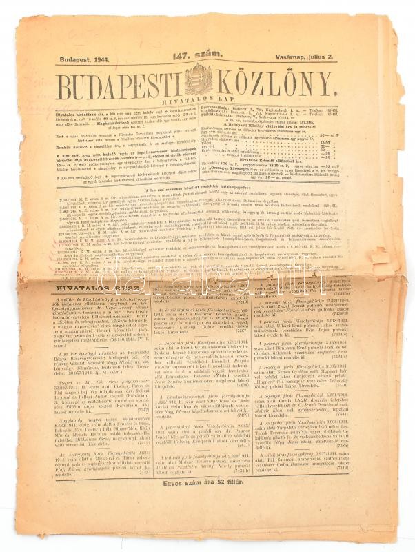 1944 Budapesti Közlöny 1944. július 2. 147. sz., szakadozott, széteső ... https://www.darabanth.com/hu/422-Gyorsarveres/422.0/Mutargy-papirregiseg-egyeb/Nyomtatvanyok~1000002/1944-Budapesti-Kozlony-1944-julius-2-147-sz-szakadozott-szeteso-allapotban-alahuzaso~II2679942