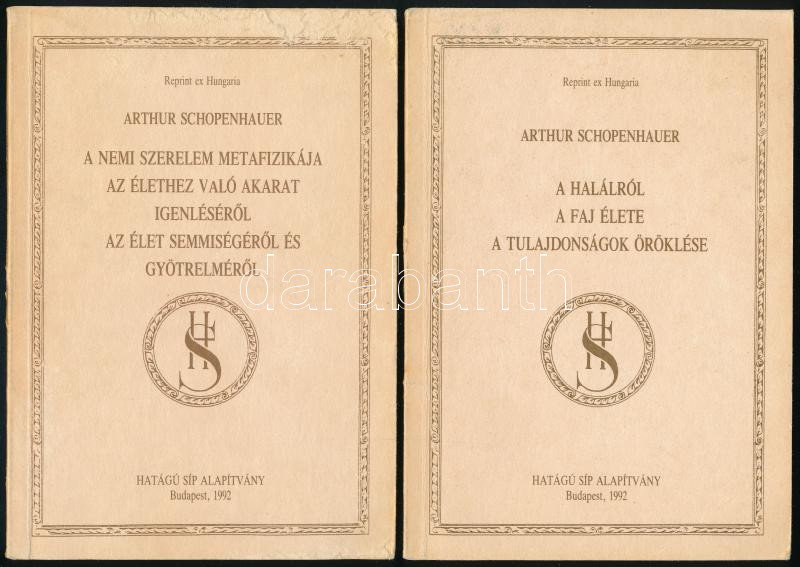 A nemi szerelem metafizikája. Az élethez való akarat igenlésérÅ‘l. Az élet semmiségérÅ‘l és gyötrelmérÅ‘l.; halálról. A faj élete. A tulajdonságok öröklése.; Bp., 1992, Hatágú SÃp AlapÃtvány. Reprintek. Kiadói papÃr-kötések, az egyik kopott borÃtóval.