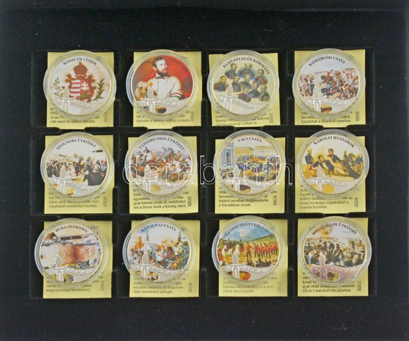 Leírás: DN "A szabadságharc képes krónikája" 12xklf darabból álló festett, ezüstözött CuZn emlékérem szett kapszulákban, éremtartó kazettában T:PP