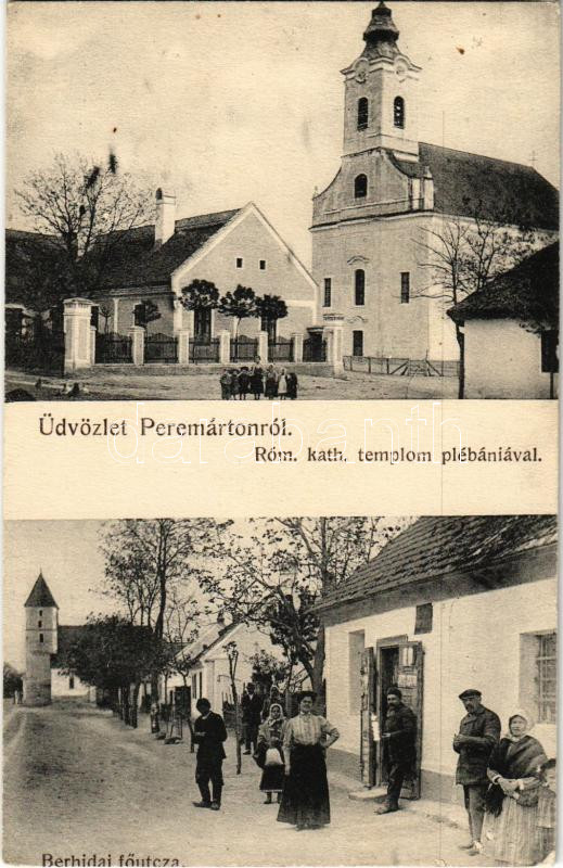 Leírás: 1913 Peremarton, Peremárton (Berhida); Római katolikus plébánia és templom, Fő utca, üzlete. Freudenberg Miksa kiadása