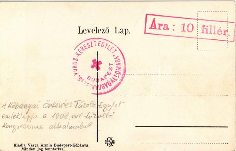 Leírás: Budapest X. Kőbánya, A Kőbányai Önkéntes Tűzoltó Egylet emléklapja az 1908. évi Tűzoltó Kongresszus alkalmából. Varga Ármin kiadása + "Vörös-Kereszt Egylet Betegnyugvó állomása Budapest"