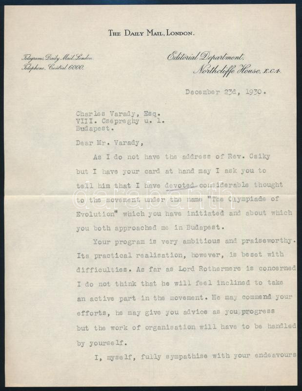 George Ward Price (1886-1961) ujságíró autográf aláírt levél / Auptgraph signed letter