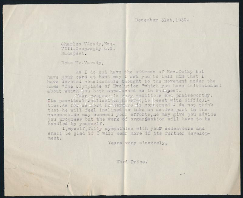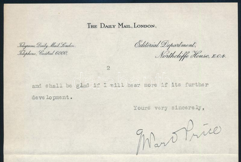 George Ward Price (1886-1961) ujságíró autográf aláírt levél / Auptgra...