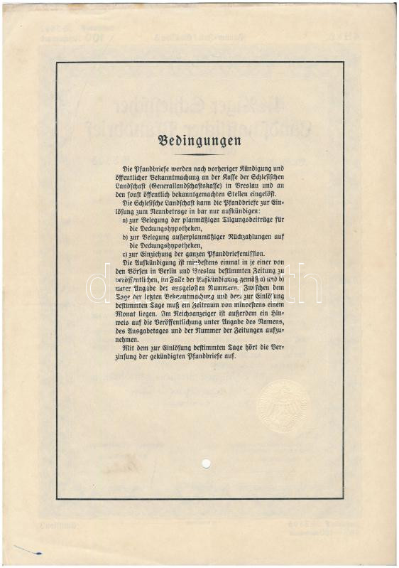 Leírás: Német Harmadik Birodalom / Wroclaw (Breslau) 1940. "Sziléziai 4 1/2%-os Államkölcsön Kötvény" 100M-ról, szárazpecséttel, lyukasztással érvénytelenítve T:AU fo.
