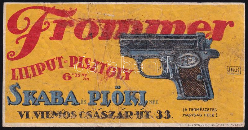 Frommer Liliput-pisztoly számolócédula, kissé viseltes állapotban https://www.darabanth.com/hu/441-Gyorsarveres/441.0/Mutargy-papirregiseg-egyeb/Reklam~500026/Frommer-Liliput-pisztoly-szamolocedula-kisse-viseltes-allapotban~II2898657