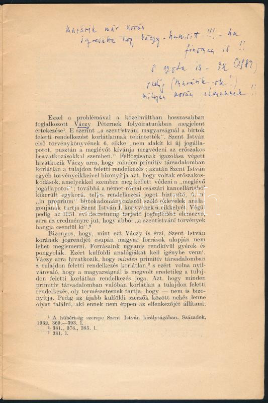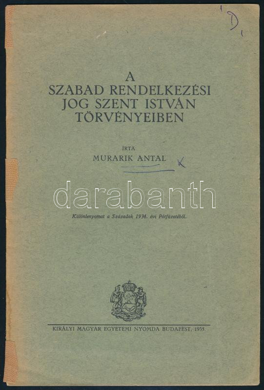 Murarik Antal: A szabad rendelkezési jog Szent István törvényeiben. (Különlenyomat a Századok 1934. évi Pótfüzetéből). Bp., 1935, szerzői kiadás (K. M. Egyetemi Ny.), 15+(1) p. Kiadói tűzött papírkötés, a gerincen ragasztott, egy oldalon tollal írt bejegyzéssel. A szerző által Vitéz Pálfi János egyetemi tanár részére DEDIKÁLT példány.
