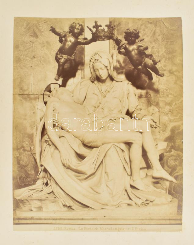 cca 1900 Róma, Michelangelo Pieta ("Fájdalmas anya") szobra a vatikáni Szent Péter-bazilikában, nagyméretű, kartonra kasírozott fotó, kissé hullámos, 26x20,5 cm
