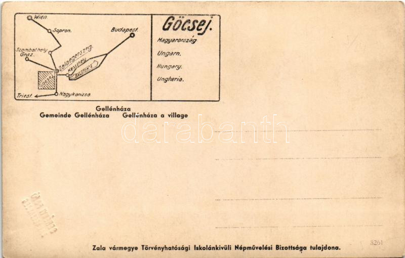 Gellénháza (Zala), utca. Hátoldalon Göcsej térkép. Serényi Fotó https://www.darabanth.com/hu/445-Gyorsarveres/445.0/Kepeslapok/Magyarorszag~2000005/Gellenhaza-Zala-utca-Hatoldalon-Gocsej-terkep-Serenyi-Foto~II2938681