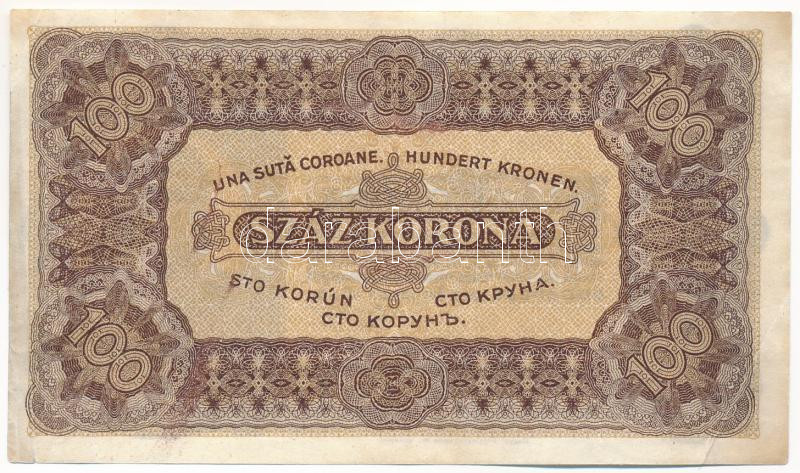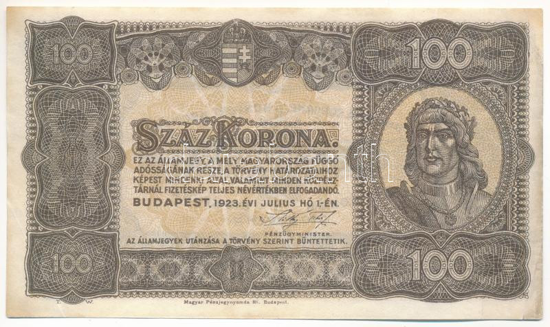 Leírás: 1923. 100K "Magyar Pénzjegynyomda Rt." nyomdahely jelöléssel T:F apró szakadás, folt