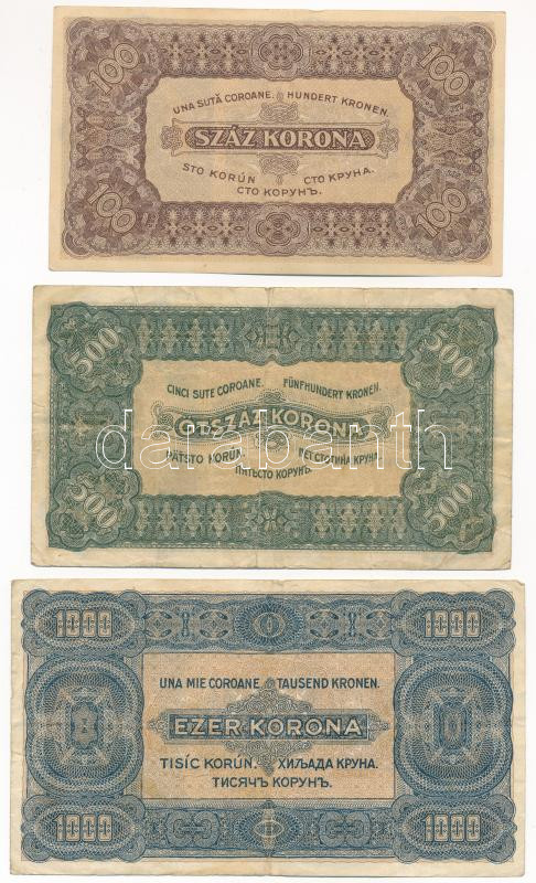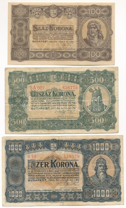 1923. 100K nyomdahely-megjelölés nélkül + 500K "Magyar Pénzjegynyomda Rt. Budapest" nyomdahely-megjelöléssel + 1000K "Magyar Pénzjegynyomda Rt. Budapest" nyomdahely-megjelöléssel T:XF-F