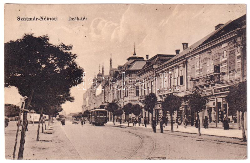 1915 Szatmárnémeti, Szatmár, Satu Mare; Deák tér, üzletek, villamos. H... https://www.darabanth.com/hu/446-Gyorsarveres/446.0/Kepeslapok/Erdely~2000007/1915-Szatmarnemeti-Szatmar-Satu-Mare-Deak-ter-uzletek-villamos-Huszar-Aladar-kiadasa-~II2917096