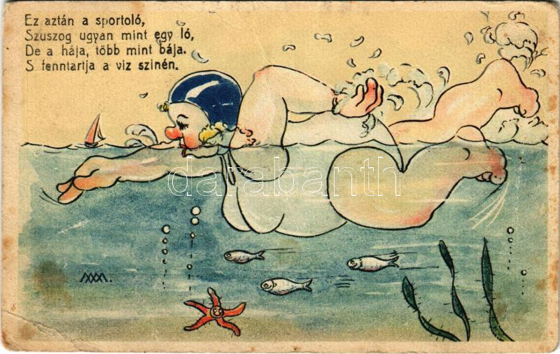Leírás: 1943 Ez aztán a sportoló, szuszog ugyan mint a ló, de a hája több mint bája. S. fenntartja a víz színén / Humour with fat woman. Cecami n. 1010. (fa)