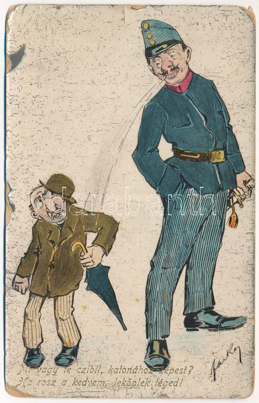 1915 Mi vagy te czibil, katonához képest? Ha rossz a kedvem leköplek téged! Antiszemita képeslap, Judaika / Hungarian Anti-Semitic postcard. Judaica (kopott sarkak / worn corners)
