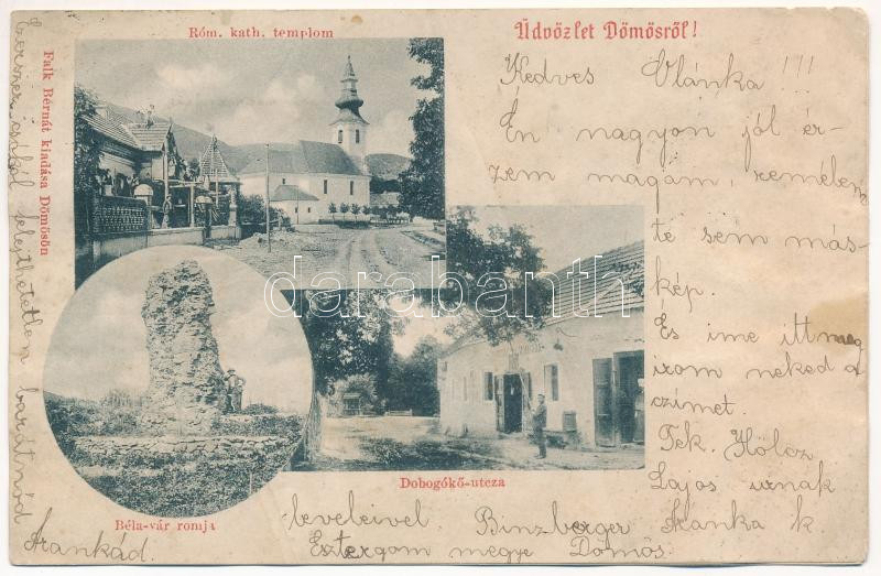 Leírás: 1900 Dömös, Római katolikus kápolna, Béla vár romjai, Dobogókő utca, házépítés, vendéglő. Falk Bernát kiadása (ázott / wet damage)