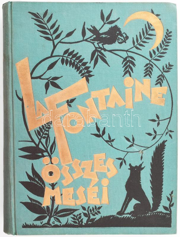 [Jean de La Fontaine (1621-1695)] La Fontaine összes meséi. Teljes magyar kiadás. Ford.: Kozma Andor, Vikár Béla, Zempléni Árpád. Haranghy Jenő rajzaival. Bp.,(1926),Dante,(Fővárosi-ny.), 1 (címkép, La Fontaine arcképe) t.+395 p. Szövegközti rajzokkal gazdagon illusztrált. Kiadói aranyozott, festett, illusztrált egészvászon-kötés, festett felső lapélekkel, a lapéleken kis foltokkal, az elülső borítón kis ütődéssel, a hátsó borítón kis folttal, de ezt leszámítva, szép állapotban. Gyűjtői darab.