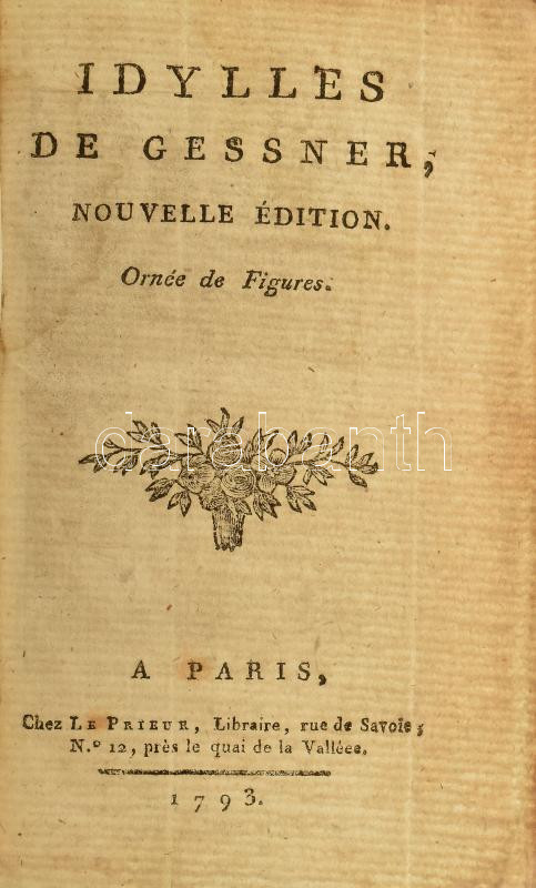 [Gessner, Salomon (1730-1788)]: Idylles de Gessner. Paris, 1793, Chez Le Prieur, Libraire, rue de Savoie No 12., 1 t. (címkép) + 248 p. Francia nyelven. Aranyozott gerincű egészbőr-kötésben, kissé sérült, kopottas borítóval, helyenként kissé foltos lapokkal, egy-két lapon kisebb szakadással.