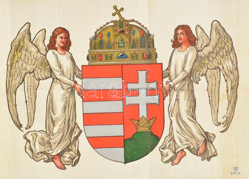 cca 1920 Angyalos címer Litográfia, hajtott, szakadt 54x38 cm