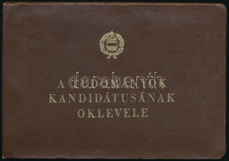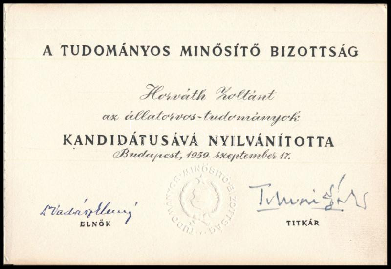 1959 Tudományos kandidátusok oklevele Horváth Zoltán állatorvos részére, Dr. Vadász Elemér (1885-1970) kétszeres Kossuth-díjas geológus, a Tudományos Minősítő Bizottság elnökének autográf aláírásával, szárazbélyegzővel (az oklevél elvált a borítótól)