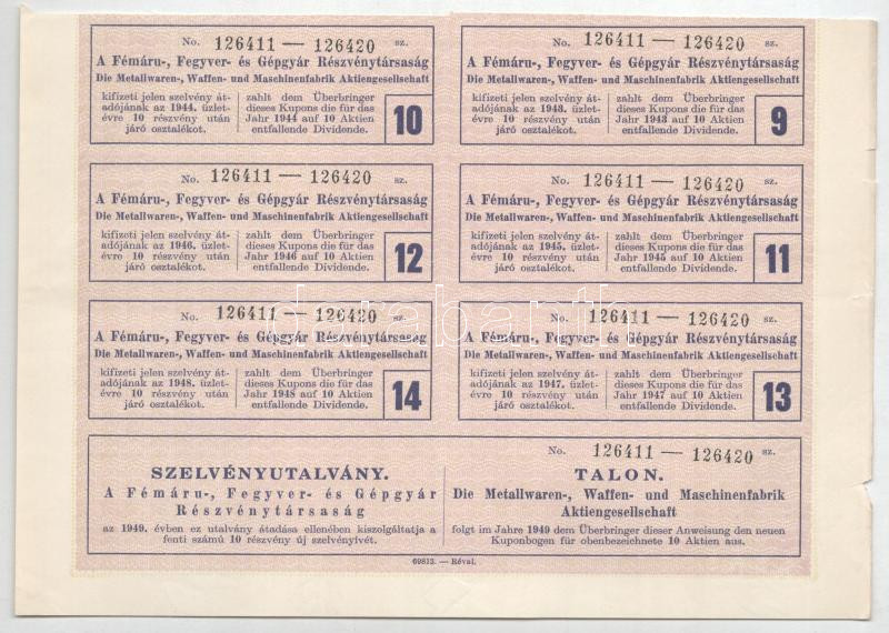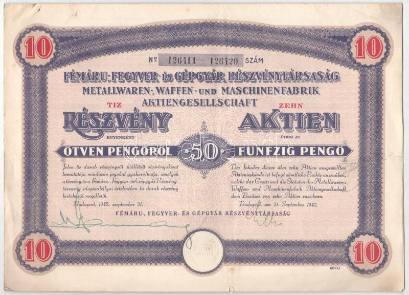 Budapest 1935. "Fémáru-, Fegyver- és Gépgyár Részvénytársaság" tíz részvénye egyben, egyenként 50P-ről, német és magyar nyelven, bélyegzésekkel, szelvényekkel T:VF