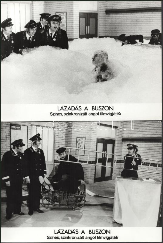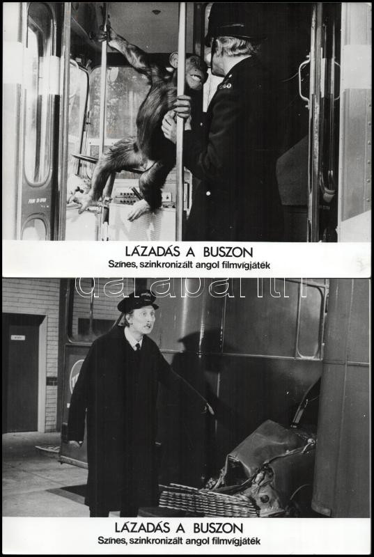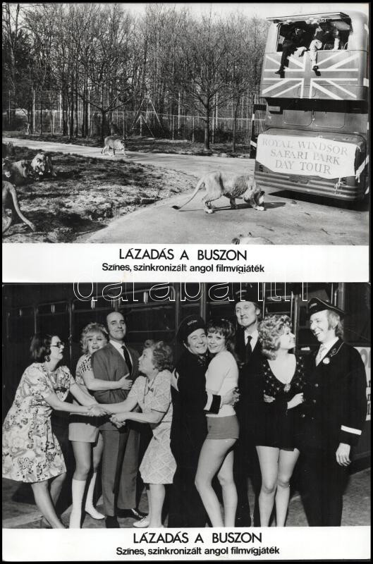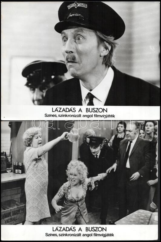 cca 1972 ,,Lázadás a buszon" című angol abszurd humor, filmvígjáték jelenetei és szereplői, 29 db vintage produkciós filmfotó ezüst zselatinos fotópapíron, a használatból eredő (esetleges) kisebb hibákkal, 18x24 cm