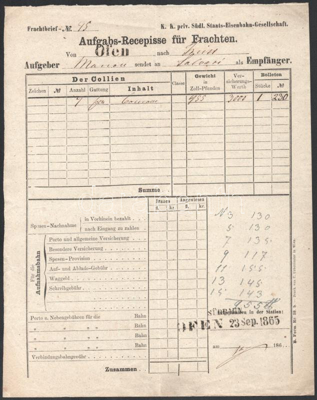 1865 Ofen, K. k. priv. österr. Staats-Eisenbahn-Gesellschaft vasúti fu... https://www.darabanth.com/hu/45-Nagyaukcio/45.1/Mutargy-papirregiseg-egyeb/Okmanyok~18546/1865-Ofen-K-k-priv-osterr-Staats-Eisenbahn-Gesellschaft-vasuti-fuvarlevel~II3447948