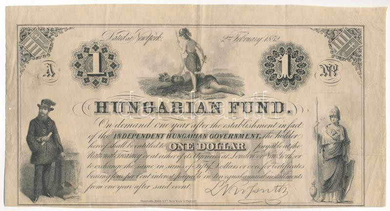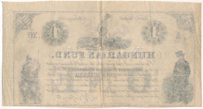 1852. 1$ "A" "Kossuth bankó" sorszám nélkül T:F fo., tűlyuk Hungary 1852. 1 Dollar "A" "Hungarian Fund" without serial number C:F spotted, pin hole Adamo G117/1b