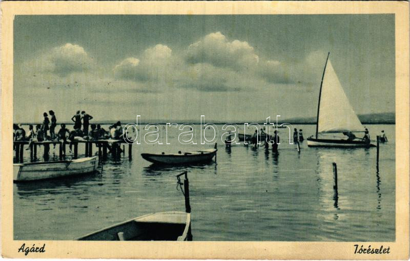 Leírás: 1943 Agárd (Gárdony), Velencei-tó, fürdőzők, vitorlás. Csajka bazár kiadása (EK)