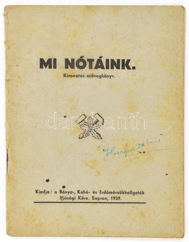 Mi nótáink. Kivonatos szövegkönyv. Sopron, 1939. Bánya- kohó- és Erdőm... https://www.darabanth.com/hu/452-Gyorsarveres/452.0/Konyvek/Konyvek-Utazas-helytortenet~1000016/Mi-notaink-Kivonatos-szovegkonyv-Sopron-1939-Banya-koho-es-Erdomernokhallgatok-Ifjusagi~II3014029