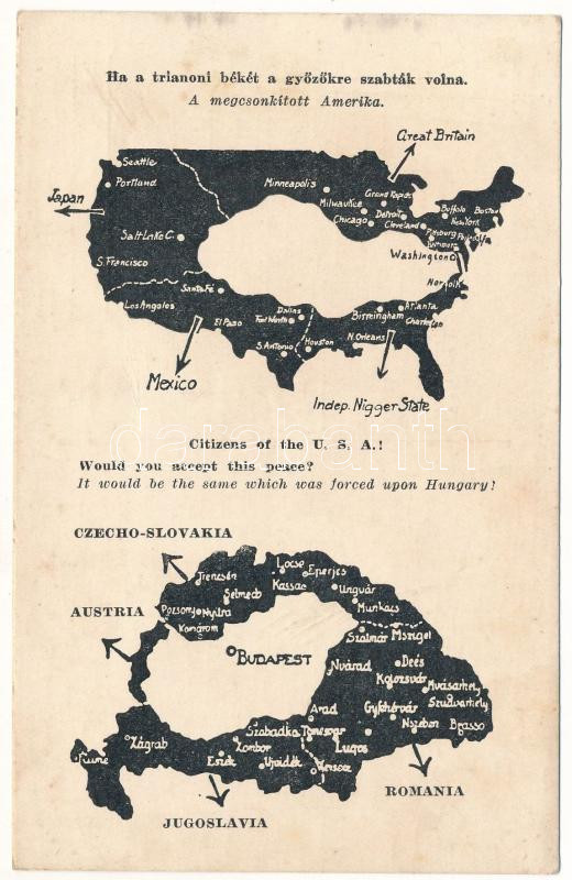 Ha a trianoni békét a győzőkre szabták volna. A megcsonkított Amerikai Egyesült Államok. Kiadja a Magyar Nemzeti Szövetség / Treaty of Trianon, map of a lesser USA, Hungarian irredenta propaganda (fl)