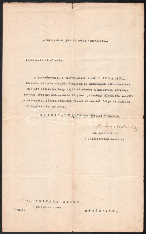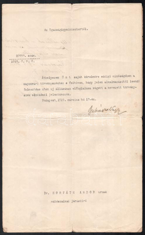 1919 március 17. A Károlyi-kormány igazságügyminisztere által kiállított okirat Juhász Nagy Sándor igazságügy-miniszter saját kezű aláírásával, bélyegzőjével + járásbírósági felmentő okirat