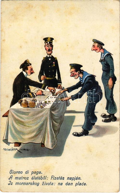 A matróz életéből: Fizetés napján / Giorno di paga / Iz mornarskog zivota: na dan place / K.u.K. Kriegsmarine Matrosen / Austro-Hungarian Navy mariner humor. C. Fano Pola 23. 1914/15. s: Ed. Dworak (fl)