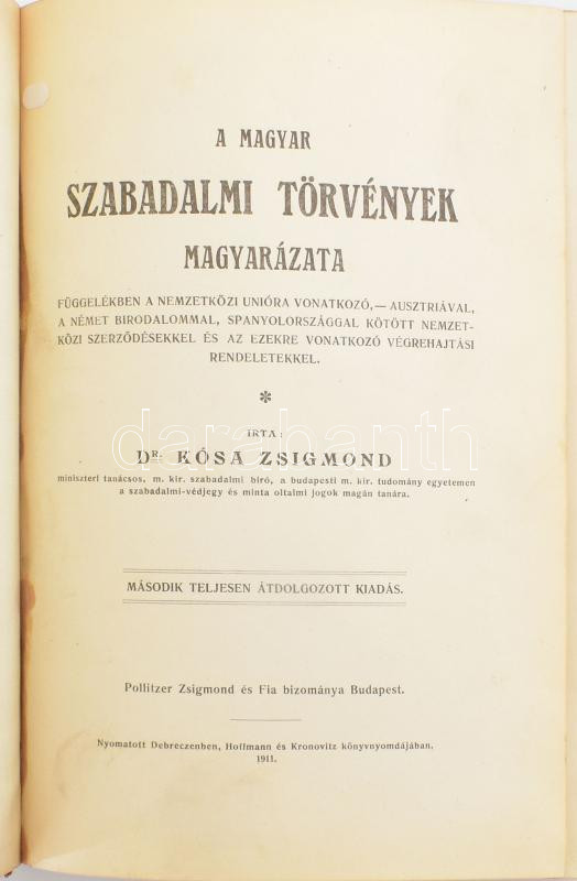 Kósa Zsigmond: A magyar szabadalmi törvények magyarázata. Debrecen, 1911, Hoffmann és Kronovitz. Második kiadás. Kiadói félvászon-kötés, kopott borítóval, sérült és részben hiányos gerinccel, a hátsó borítón részben hiányos papírborítással.