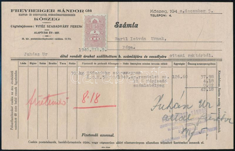 1940 Kőszeg, Freyberger Sándor cég Szappan- és Gyertygyár, Nyersbőrker... https://www.darabanth.com/hu/458-Gyorsarveres/458.0/Mutargy-papirregiseg-egyeb/Okmanyok~1000021/1940-Koszeg-Freyberger-Sandor-ceg-Szappan-es-Gyertygyar-Nyersborkereskedes-fejleces-szamla~II3068231