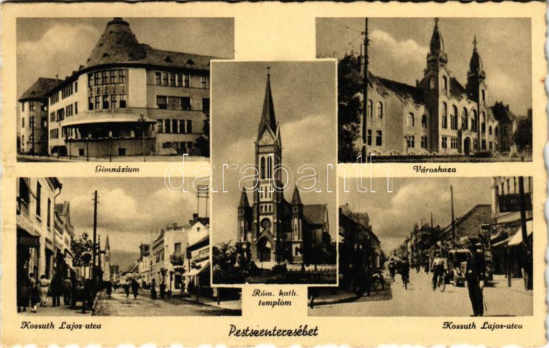 1939 Budapest XX. Pestszenterzsébet, Pesterzsébet, Erzsébetfalva; Gimnázium, Városháza, Kossuth Lajos utca, Római katolikus templom, üzletek, rendőr (EK)