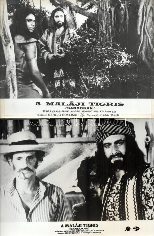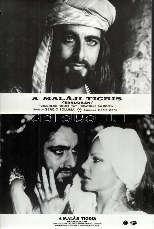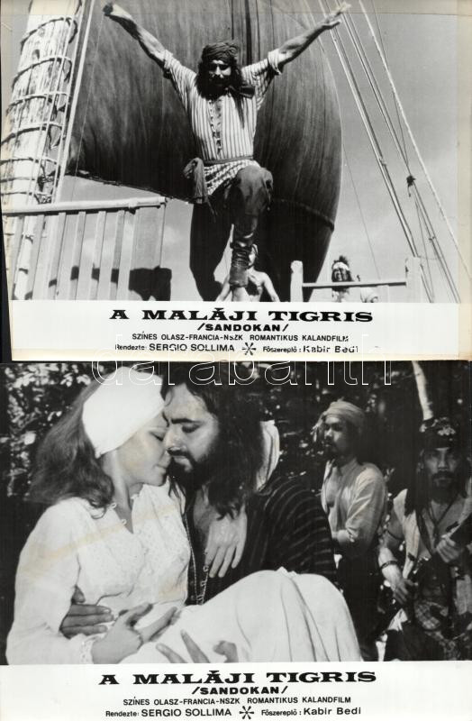 cca 1976 Kabir Bedi filmszínész ,,A maláji tigris - Sandokan" című film kilenc jelenetében, 9 db vintage produkciós filmfotó (vitrinfotó, lobbyfotó) ezüst zselatinos fotópapíron, a használatból eredő (esetleges) kisebb hibákkal, 18x24 cm