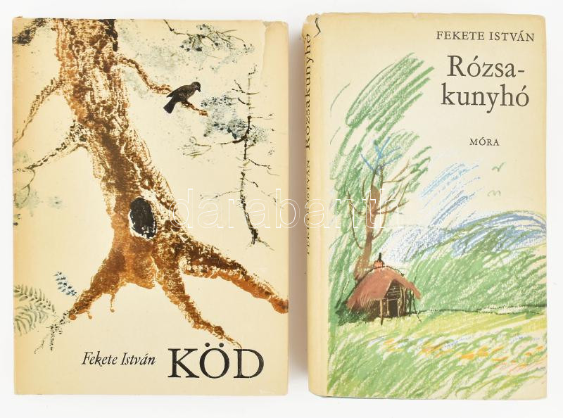 Leírás: Fekete István: Rózsakunyhó. Elbeszélések és karcolatok. Vál. és szerk., az előszót írta Nagy Domokos Imre. Würtz Ádám rajzaival illusztrált. Bp., 1973, Móra. Első kiadás! Kiadói egészvászon kötés, kiadói szakadt papír védőborítóval + Fekete István: Köd. Bp., 1967, Móra. A borító illusztráció Urai Erika munkája. Kiadói kartonált papírkötésben, szakadt kiadói papír védőborítóban.