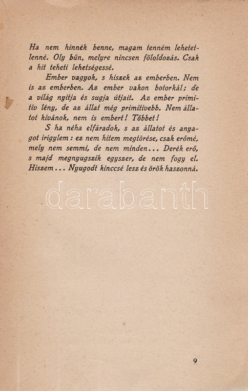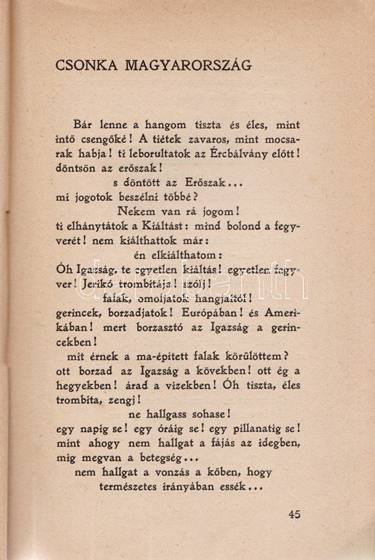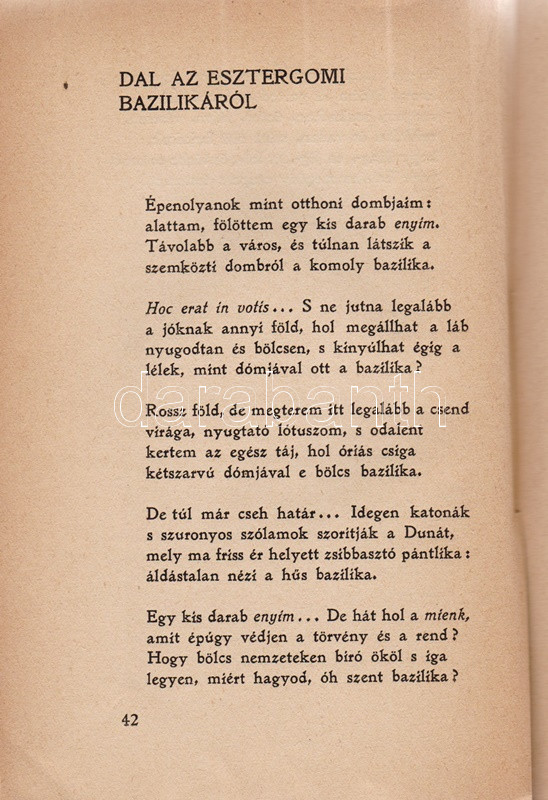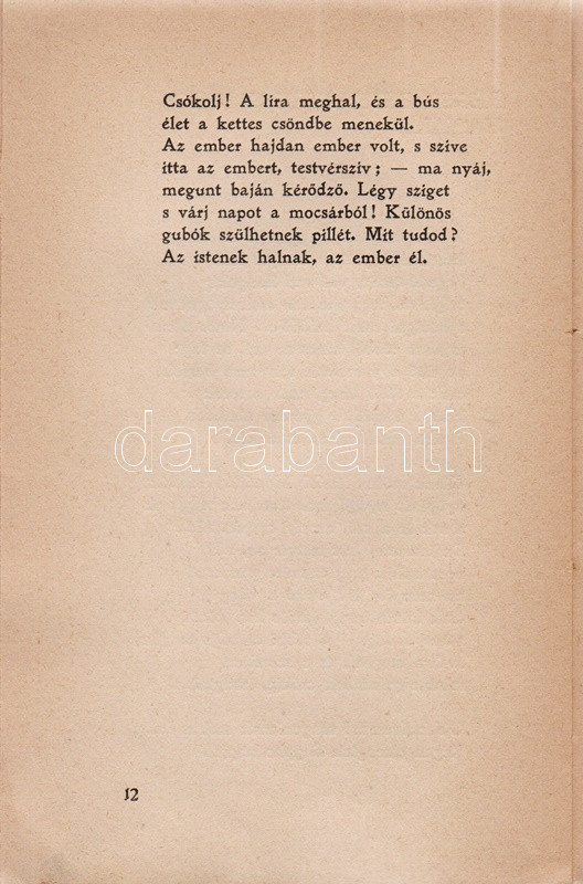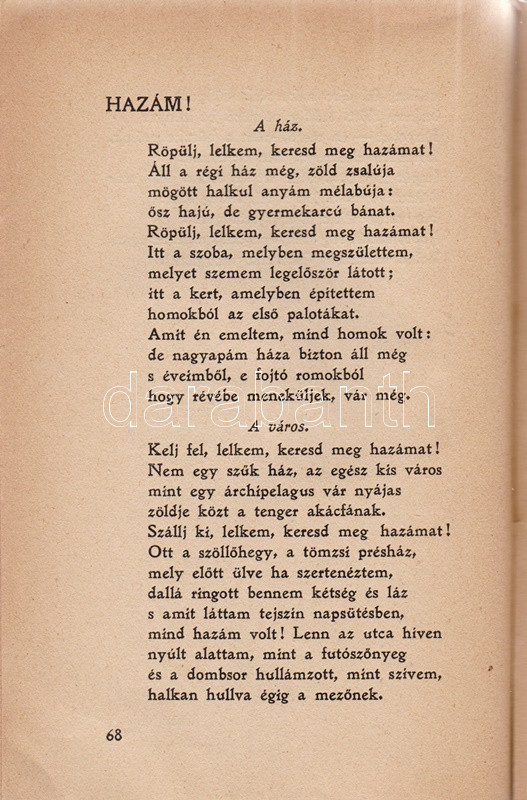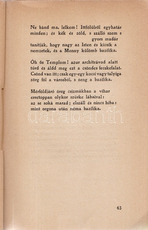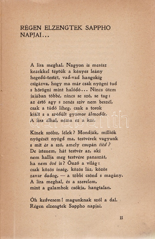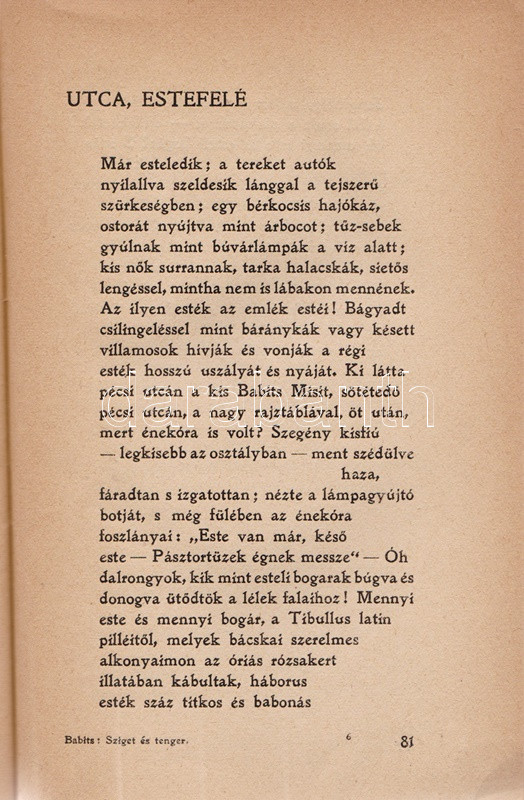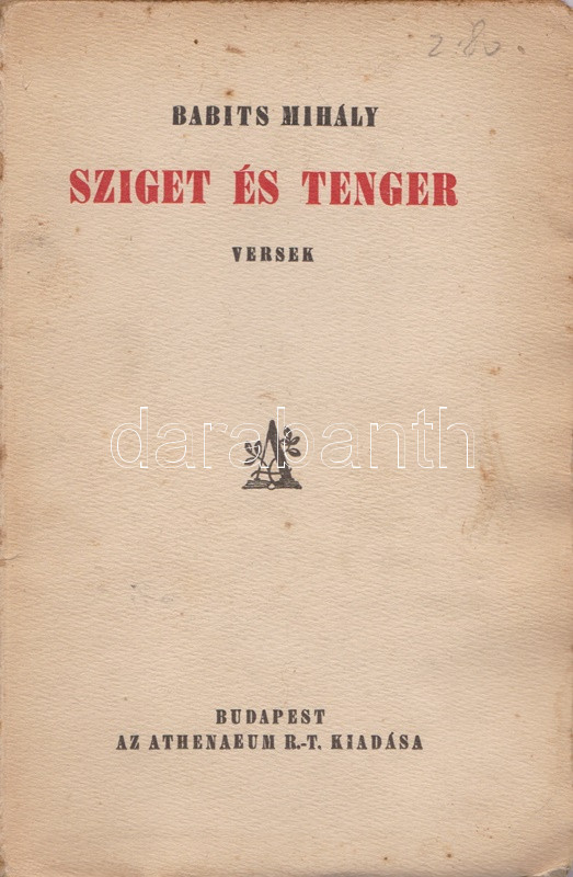 Babits Mihály: Sziget és tenger. Versek. Budapest, [1925]. Athenaeum Irodalmi és Nyomdai Rt. 100 p. Első kiadás. Babits Mihály verseskötete személyes hangú előszóval indul, a versközlések közül az első pedig rögtön a legismertebbek közül való, ,,Rég elzengtek Sappho napjai..." címmel. A kötet jó néhány szövege az 1945 utáni kiadásokban csak megcsonkítva jelenhetett meg (Dal az esztergomi bazilikáról, Hazám!), egy szöveg pedig rendre kimaradt a Babits-közlésekből (Csonka Magyarország), jóllehet a szövegek maguk lényegesen komplexebbek az irredenta ideológia egyszerű felmondásánál. Botka 285. Fűzve, enyhén foltos, enyhén sérült kiadói borítóban. Körülvágatlan példány.